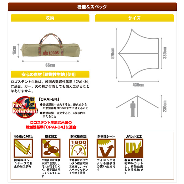 LOGOS ナバホ ブリッジヘキサタープセット-BB ■総重量:(約)4.3kg ■対応人数:4人 ■収納サイズ:(約)縦16×横66×高さ16cm ■耐水圧:1600mm ■構成:シート、ポール、ポール固定用ロープ、ロープ、収納バッグ、ポール用収納袋、ペグ、ハンマー、小物袋 ■主素材: [ポール]スチール [シート]難燃性ポリタフタ ■性能/特長: [シート]防水加工、撥水加工、難燃加工、UV-CUT加工 ・TepeeテントにLINK可能 ・左右非対称なので様々なレイアウト設定が可能 ・Tepeeテントの前室代わりやスペース拡張に最適 ・高さ3段階 ■難燃加工:米国基準CPAI-84適合 ※付属品のペグとハンマーは、晴天無風の整地された環境下でのご使用を想定した製品仕様となります。 悪天候や不整地な状況下でご使用される場合は、状況に適した仕様のものをお求めください。 ※記載は商品仕様の一部です。仕様説明不足等の理由での返品はできません。特に適合等は必ずご確認ください。