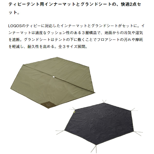 LOGOSのティピーに対応したインナーマットとグランドシートがセットに。インナーマットは適度なクッション性のある3層構造で、地面からの冷気や湿気を遮断。グランドシートはテントの下に敷くことでフロアシートの汚れや摩耗を軽減し、耐久性を高める。全3サイズ展開。