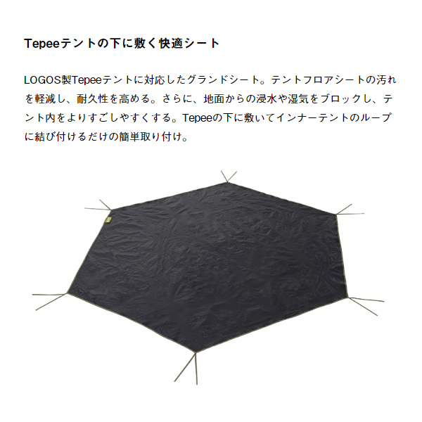 LOGOS製Tepeeテントに対応したグランドシート。テントフロアシートの汚れを軽減し、耐久性を高める。さらに、地面からの浸水や湿気をブロックし、テント内をよりすごしやすくする。Tepeeの下に敷いてインナーテントのループに結び付けるだけの簡単取り付け。