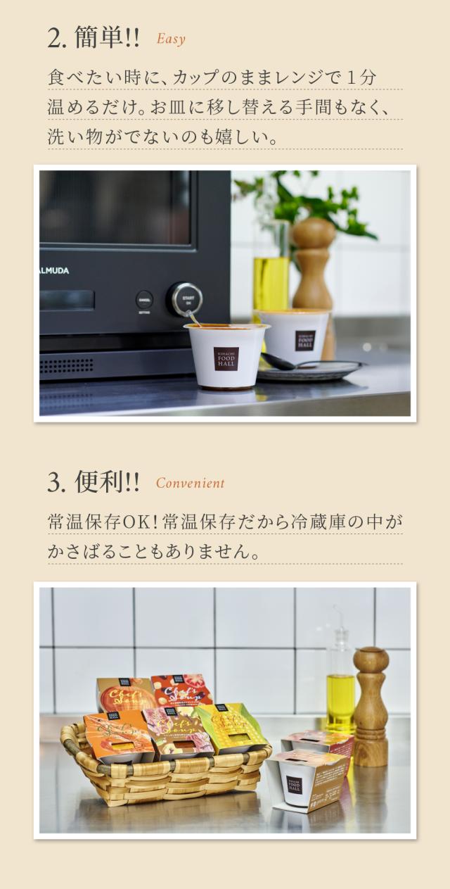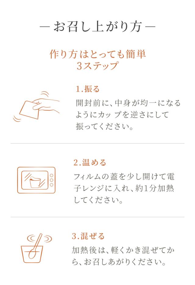 | 東京青山のレストラン「KIHACHI」のシェフが監修した5種類の美味しいスープとカレーをカップに閉じ込めました。常温で保存でき、食べる時にレンジで1分、温めるだけ。シェフのこだわりの味が自分の好きな場所、好きなシーンで手軽にお楽しみいただけます。 <召しあがり方> 1. 開封前に、中身が均一になるようにカップを逆さにして振ってください。 2. フィルムの蓋を少し開けて電子レンジに入れ、記載された時間を目安に加熱してください。 3. 加熱後は、軽くかき混ぜてから、お召しあがりください。 ・電子レンジ加熱目安 500W 約1分10秒 600W 約1分 ※お好みにより少しずつ再加熱して下さい。 ※加熱時間は機種により異なることがあります。 ※自動(オート)ボタンは使用しないでください。 |