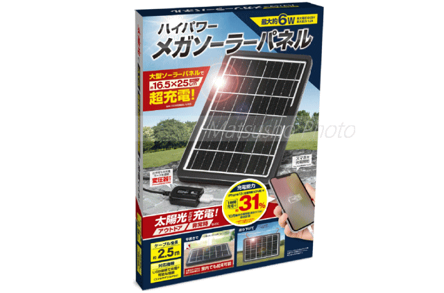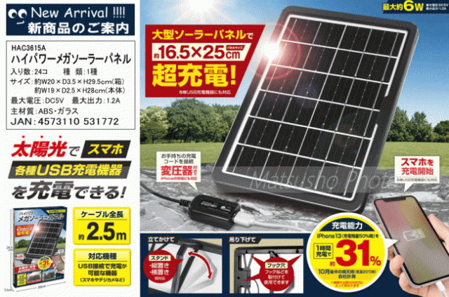 最大約6W!ソーラーパネル搭載、太陽光だけでスマホやタブレットなどのデバイス機器を充電できます。太陽光をエネルギーに変えて出力しUSBで接続可能な機器(スマホやデジカメなど)を充電します。電源供給減のないアウトドアシーンや停電時などで大活躍!■品番HAC3615■サイズ[本体]約W19×D2.5×H28cm[箱]約W20×D3.5×H29.5cm■重量[本体]約623g[箱込]約715g■電源方法:ソーラー発電(蓄電機能はありません)■最大出力1.2A■最大電圧DC5V■主材質:ABS・ガラス■カラー:ブラック■セット内容:本体×1個※充電するモバイル機器や太陽光の状況により充電効率は異なります。モバイル機器への充電コードは付属しておりません。防水機能はありませんので雨や水にかかる場所では使用しないで下さい。本製品に蓄電(本製品内に電気を蓄える)の機能はありません。本製品を吊り下げて使用される際のフックは別途ご用意下さい。