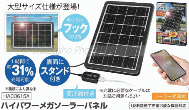 ハック ソーラー充電 ソーラーパネル ソーラーチャージャー 充電 太陽光 USB充電 非常用充電 アウトドア キャンプ 非常時 防災 災害 HAC ハイパワーメガソーラーパネル 3615A
