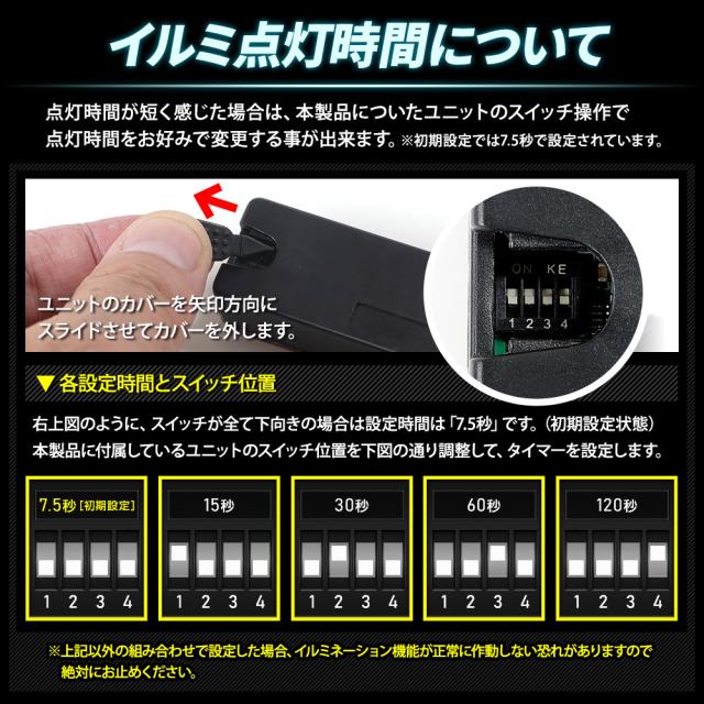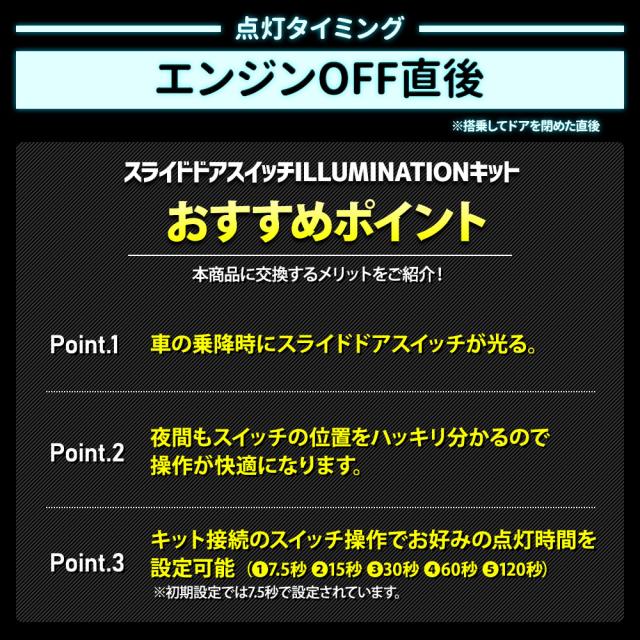 | 夜でもスイッチ操作が快適に! スライドドアスイッチイルミネーションキットが新発売! 純正時は点灯しなかったエンジンOFF直後にスライドドアスイッチが点灯! 夜間にスライドドアのスイッチが見つからない不便さが解消されます! キット接続のスイッチ操作でお好みの点灯時間を設定可能(?7.5秒 ?15秒 ?30秒 ?60秒 ?120秒) ※初期設定では7.5秒で設定されています。 配線加工不要!カプラーオン設計 |