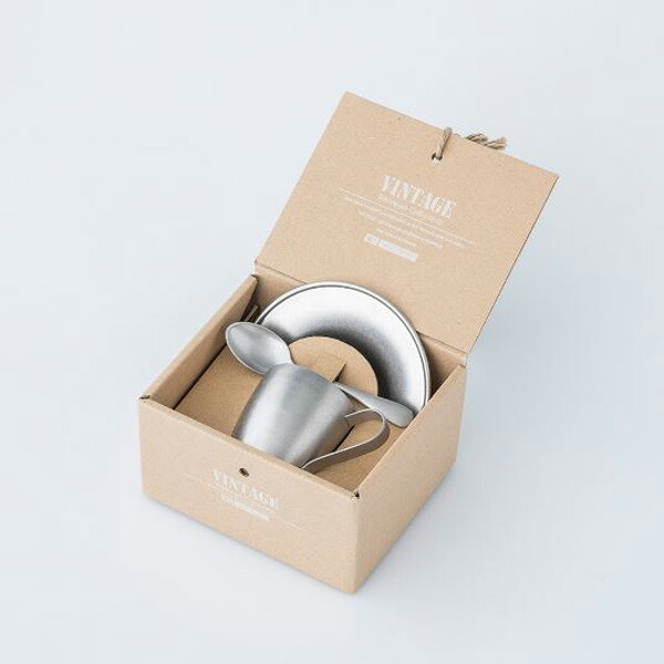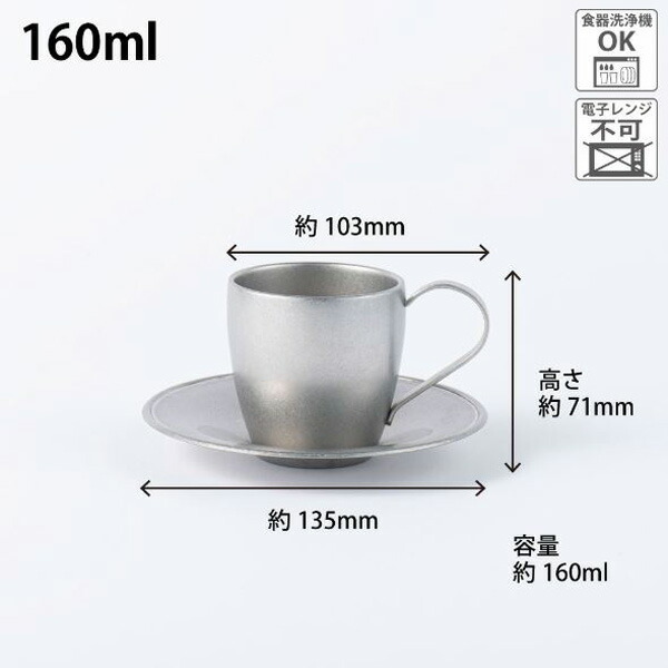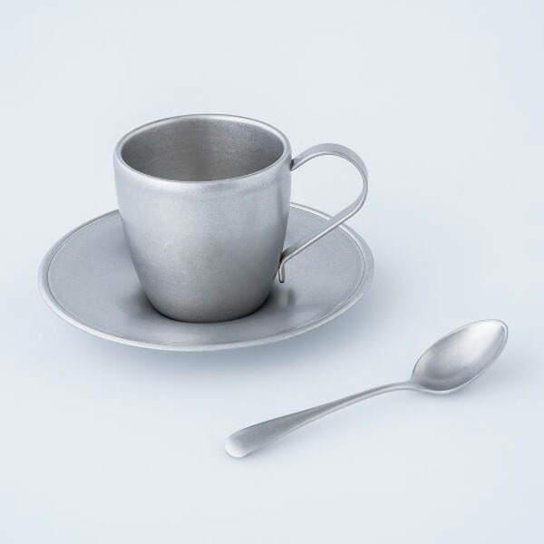 ステンレス製のカップ&ソーサーとコーヒースプーンのセット