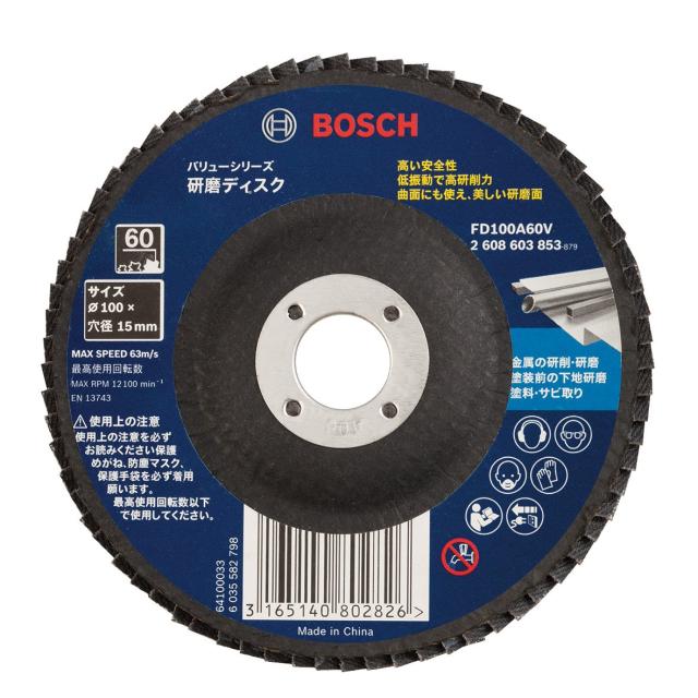 外径:100mm<br>粒度:#120<br>取付穴径:15mmφ<br>最高使用回転数:12,100回転/分<br>用途:金属の研削・研磨、塗装前の下地研磨、塗装・サビ取り<br>掲載した製品やアクセサリー等は、改良のため予告なく仕様及び外観等を変更する場合があります<br>◆商品名:BOSCH(ボッシュ) バリューシリーズ・100mm研磨ディスク#120 FD100A120V<br>●高い安全性(ヨーロッパ安全規格EN13743)