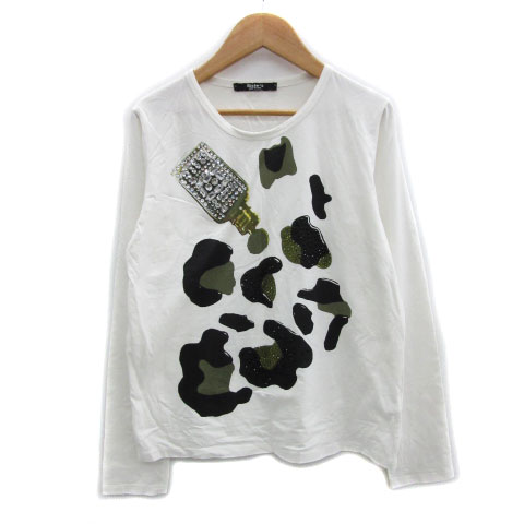 【中古】システス Tシャツ カットソー 長袖 ラウンドネック 総柄 ビジュー ラインストーン ホワイト 白 レディース
