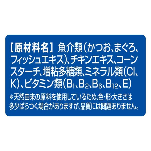 | 魚介類(かつお、まぐろ、フィッシュエキス)、チキンエキス、コーンスターチ、増粘多糖類、ミネラル類(Cl、K)、ビタミン類(B1、B2、B6、B12、E) ※天然由来の原料を使用しているため、色・形・大きさは多少ばらつく場合がありますが、品質には問題ありません。 |