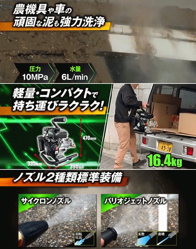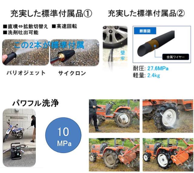 | 機能・特徴 | ・軽量・コンパクトなエンジン洗浄機です。 ・標準でバリオジェットノズルと、サイクロンジェットノズルが付属しています。 ・丈夫なゴムホースを使用しています。 |