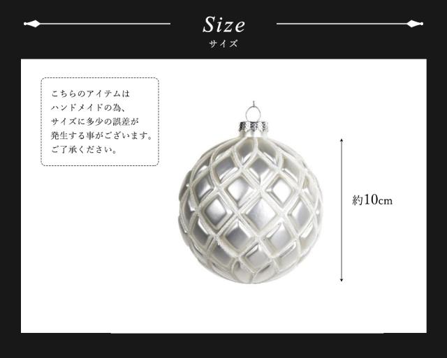 ★柔らかなパールホワイトが上品な印象を与えてくれるネットボールガラスオーナメントです。 オーナメントのテーマは『気品溢れるクリスマス』。中世ヨーロッパを彷彿とさせるクラシカルでありながらもエレガントなデザインが魅力です。重厚的で気品溢れるオーナメントが非日常のラグジュアリー感を演出します。 ガラスボールの表面には微粒のホワイトラメが網目状に絵付けされており、見る角度によってキラキラと輝きを放ちます。 洗練された華やかさとガラスならではの繊細さを併せ持ったオーナメントです。 クリスマスツリーを上品でラグジュアリーな雰囲気に仕上げたい方や、大人っぽくエレガントな雰囲気に仕上げたい方におすすめです。 季節を問わずお楽しみいただけるデザインなので、クリスマスの時期が過ぎてもお部屋のインテリアとしてお使いいただけます。玄関先やリビング、シェルフなどにそのまま置いてディスプレイするのがおすすめです。 大きめサイズの10cmボールです。 |