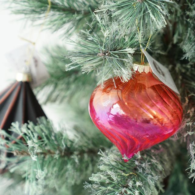 ★オレンジからピンクに移りゆくグラデーションがとても幻想的で美しいガラスボールオーナメントです。 ボールの表面には繊細な螺旋模様が施されており、そのカラフルな色使いと相まってオーナメント本来の美しさをより一層引き立てています。 カラフルでポップ、でもちょっぴりレトロな雰囲気も併せ持つ個性あふれる魅力でクリスマスツリーを色鮮やかに彩ります。ツリーの緑に映えるその美しさに注目が集まること間違いなしのオーナメントです。 ガラス特有の素材感によって光の反射や輝きなど異なる表情を見せてくれるのもまた、このオーナメントならではの魅力です。 GODDWILLらしい洗練されたデザインでクリスマスツリーに独創的かつモダンな雰囲気をもたらします。 クリスマスツリーに飾るのはもちろん、玄関先や窓際、シェルフなどに置いて飾るのもおすすめです。季節を問わずクリスマスの時期を過ぎてもお部屋のインテリアとしてお使いいただける優秀なアイテムです。 サイズは高さが約8cmです。 |