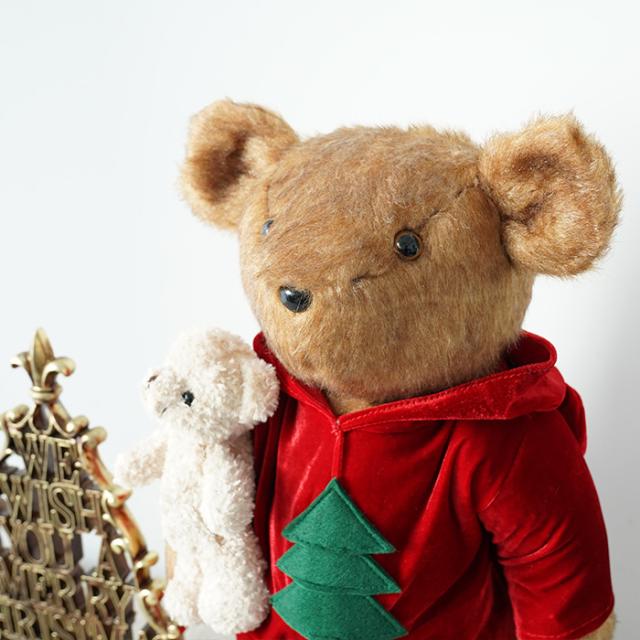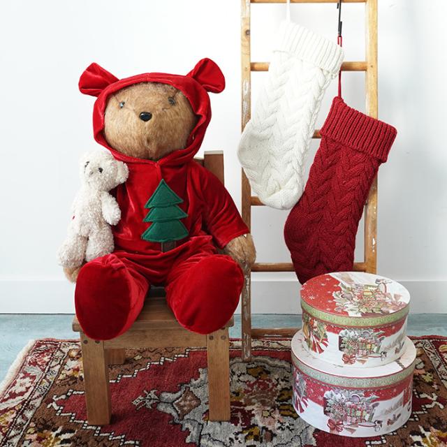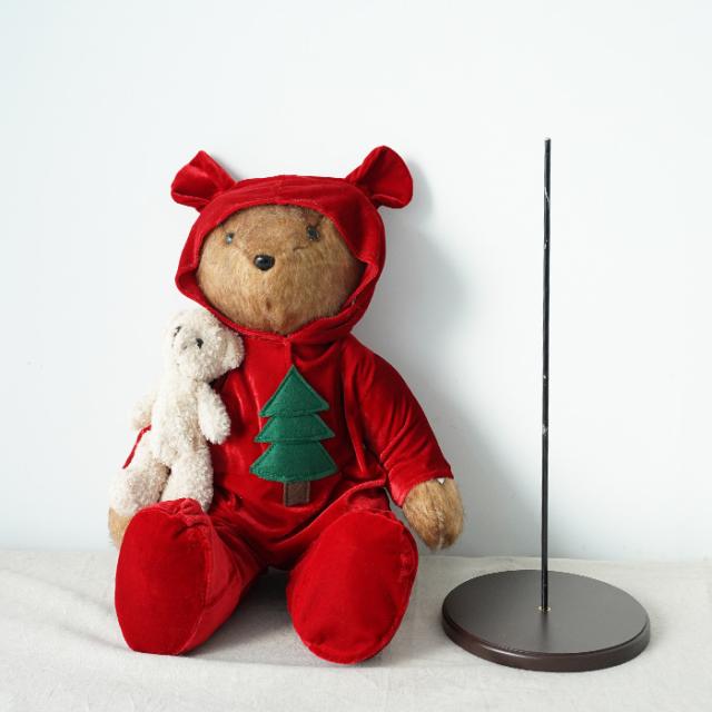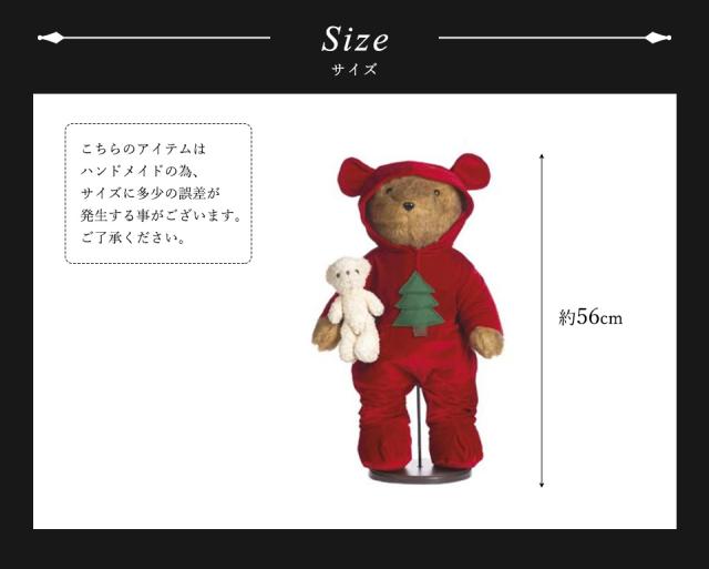 ★クマ耳のフード付きロンパースを着たテディベアです。 右手には友達の白いくまのぬいぐるみを抱えています。真っ赤なロンパースと胸のもみの木ワッペンがクリスマスの時期にぴったりです。洗練されたデザインと愛くるしい表情でいつもの日常に安らぎを与えてくれる一品です。 思わず傍に飾っておきたくなるような親しみやすさを感じるテディベア。ぬいぐるみ以上の上質な雰囲気を纏う、重厚感と高級感を兼ね備えた大人のためのインテリアオブジェです。 テディベアの手足が動くので、お好みのポージングやお気に入りの小物と合わせて様々な表情をつくり楽しむことができます。付属のワイヤースタンドを使ってまっすぐに直立させたり、スタンドから外して座らせることもできます。 おうちのインテリアとしてはもちろん、お店の店舗ディスプレイにもおすすめのアイテムです。 本体サイズは高さが約56cmです。 |