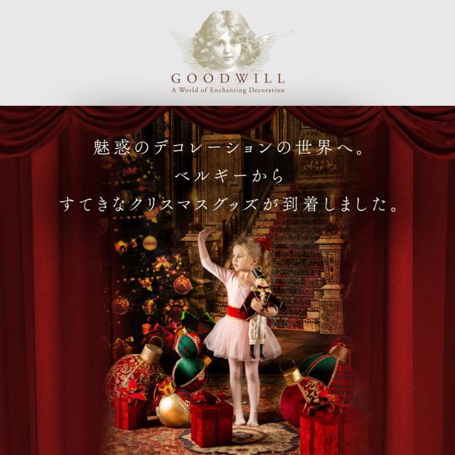 小さい頃にクリスマスの物語やすてきなおとぎ話を読んで 『物語の世界へ行ってみたい!』と夢見た事はありませんか? GOODWILLはそんな夢を叶えたいと考え1986年にベルギーで創業。クリスマスなどのシーズンイベントのデコレーションやインテリアアクセサリーを数多く展開しています。オリジナリティー溢れるどこかノスタルジックで現代的なデザインはどんなインテリアにもマッチします。 世界120カ国のバイヤーに支持されているGOODWILLの洗練されたコレクションはクリスマスだけではなく結婚式やお誕生日などのお祝いのプレゼントにも喜ばれています。 |
