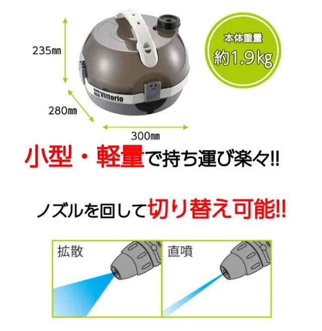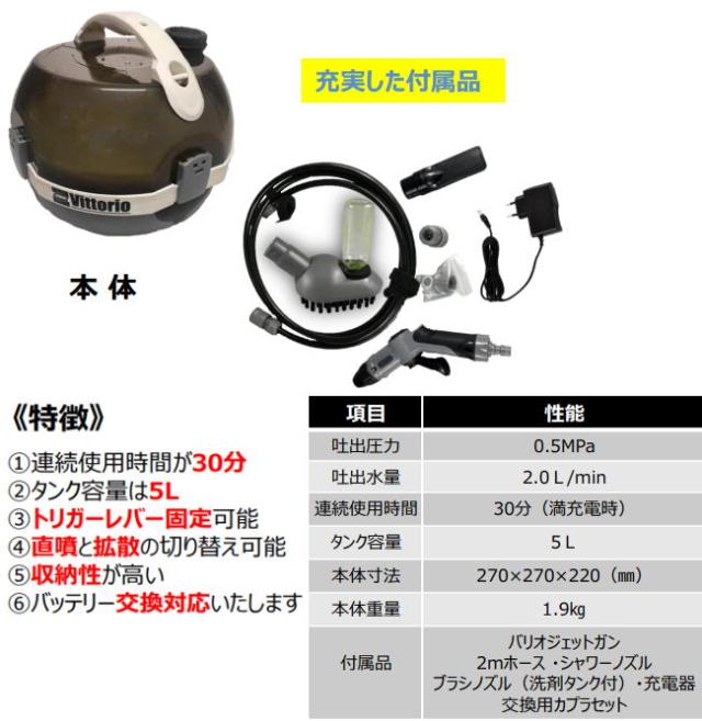 | 機能・特徴 | ・ノズルを交換することでいろいろな用途で使用できます ・充電式のため電源がとれないところでも使用できます ・タンク式で水を供給します ・コンパクトで持ち運びに便利です |
