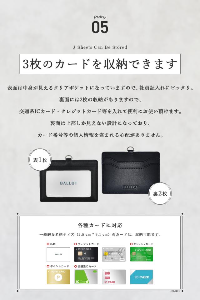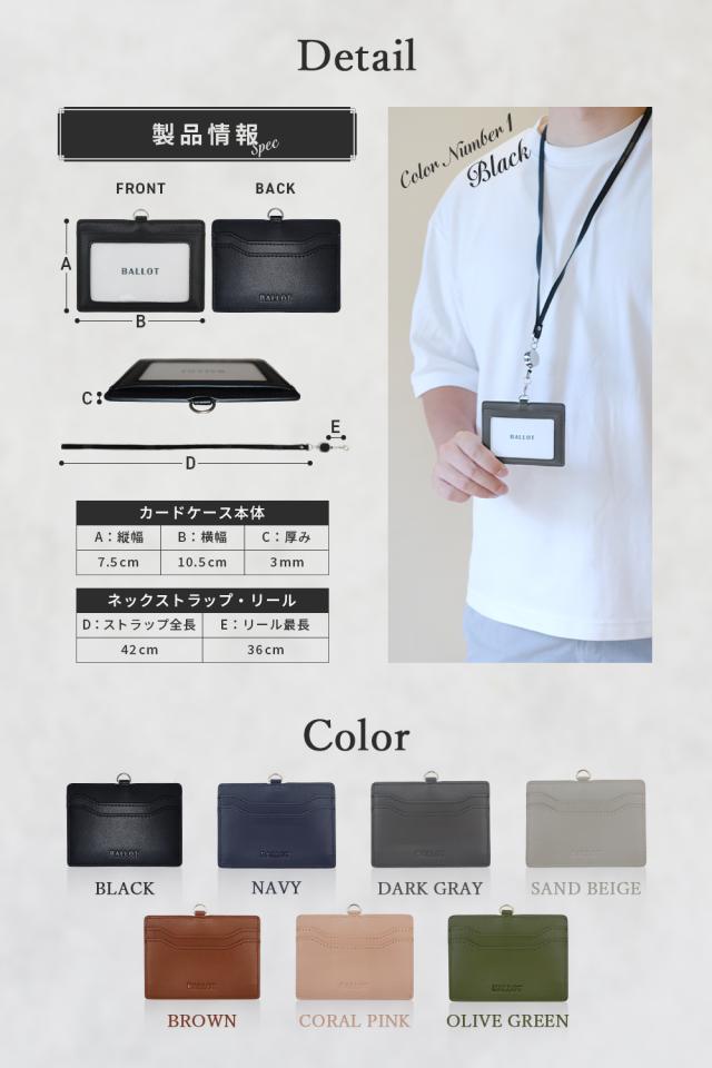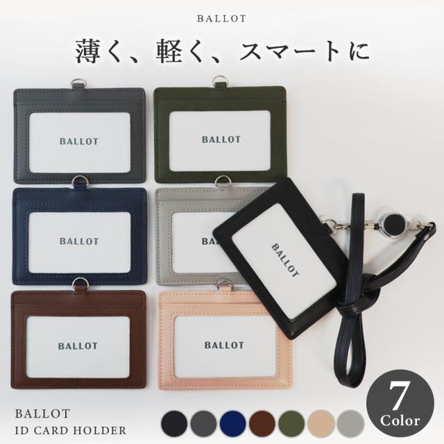 本革 IDカードホルダー 伸縮リール付き 両面 透明窓 ネームホルダー 社員証 横型 パスケース ネックストラップ BALLOT