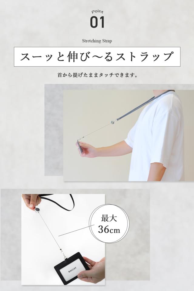【スーッと伸びるIDカードフォルダー】スーッと伸びる伸縮リール付きIDカードフォルダーです。最大36cmまで伸びますので、ICカードキーのタッチも楽々。