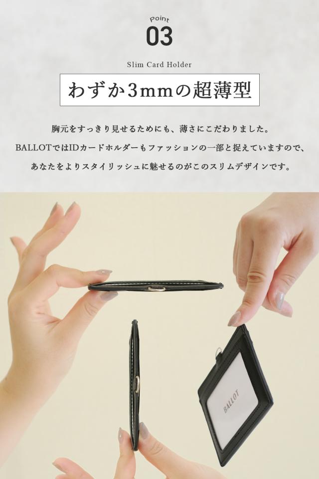 【わずか3mmの超薄型】胸元をすっきり見せるため、薄さにこだわりました。BALLOTではカードフォルダーもファッションの一部と捉えていますので、あなたをよりスタイリッシュに魅せるのがこのスリムデザインです。