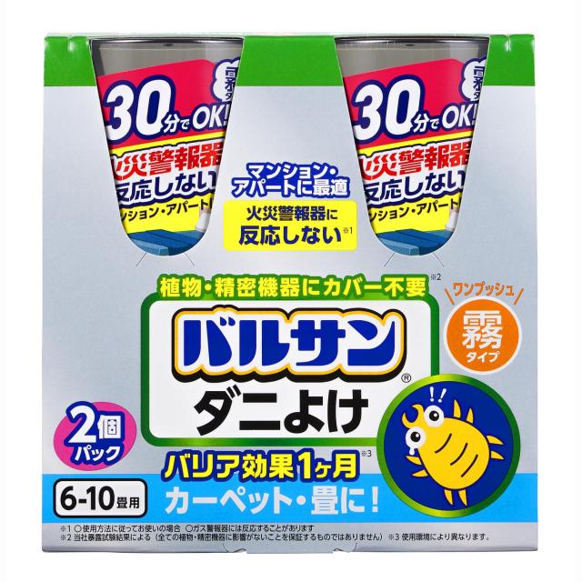 火災警報器に反応しない!30分でOKの簡単ダニ対策はやっぱりバルサン<br>お部屋の植物・家電へのカバーも不要なので、マンションやアパートに最適!<br>寝具・ソファ・カーペット・畳など大型で洗いにくい布製品まで一気にダニよけ!<br>バリア効果でダニを寄せつけない空間を1ヶ月つくります。<br>低煙・低香料タイプ。お部屋を汚しません。<br>◆商品名:バルサン ダニよけ くん煙剤 寝具 ソファ カーペット にも (6~10畳用)×2個パック / 火災警報器に反応しない/植物・精密機器カバー不要 /<br>●お部屋まるごとダニ対策ができるくん煙剤です。植物・精密機器へのカバー不要のラクラクタイプです。