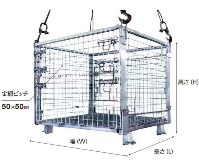 | 型式 | 荷重 (Kg) | 吊り上げ時 (Kg) | 呼称寸法(mm) | 脚高 (mm) | 扉 | 線径 (mm) | 金網ピッチ (mm) | 自重 (kg) | ||