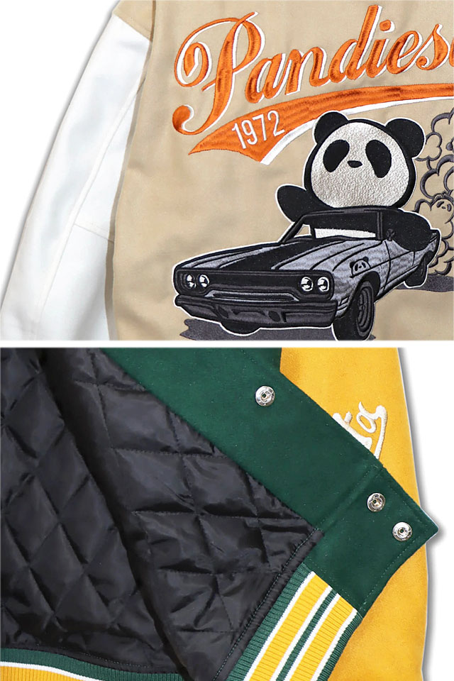 和柄ブランド【錦】の姉妹ブランドとして誕生した、お茶目なパンダをモチーフとした【PANDIESTA JAPAN】より「マッスルカーパンダカレッジスタジャン(533862)」のご紹介です。 立体的で豪華な刺繍技法「サガラ刺繍」を使用したアメカジの定番アイテム、スタジャンが今年も登場しました。 90年代のアメカジを彷彿させる配色やサガラ刺繍がビンテージ感溢れるスタジャンをテーマに、現代のトレンドアイテムとのスタイリングを考慮するため、ビッグシルエットのサイズスペックでデザインしました。 そんな荒々しく鼓動するV8エンジンを搭載するアメリカンな最強マシン『マッスルカー』に乗り込むパンディエスタをモチーフに、前後のデザインはサガラ刺繍をはじめとした刺繍とアップリケで施しました。 中綿のキルティングを裏地にしているので程よくボリューム感があり、ビッグシルエットを採用しているので今まさにコーディネートしたい一枚。 男女問わず、幅広いスタイリングをお楽しみいただけます。 | |||||||||||||||||||||||||