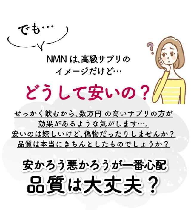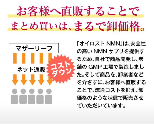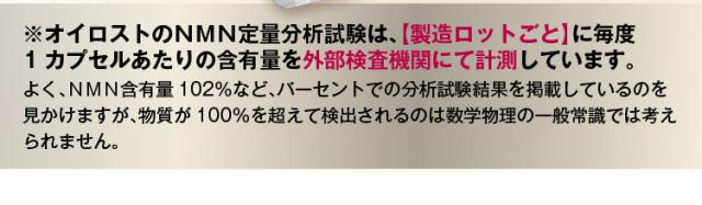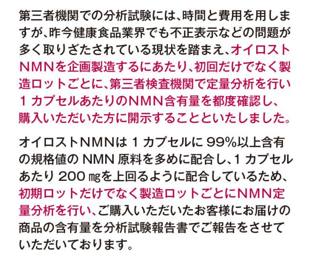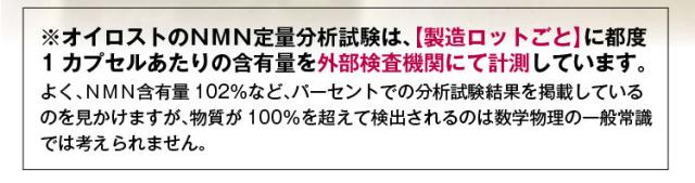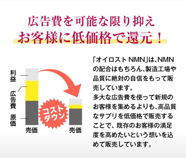 当社の『オイロストNMN』は徹底的に品質にこだわり開発を行いましたが、広告費や流通コストを抑えたことで、外部検査機関による定量分析で含有量の保証を行いながらも多くの方に手に取って頂ける価格でご提供させて頂いております。