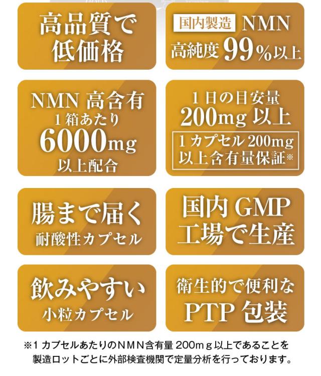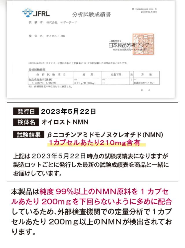 さらに製造ロットごと定量分析を行い、1カプセルあたりNMN200mg以上の含有を確認しております。