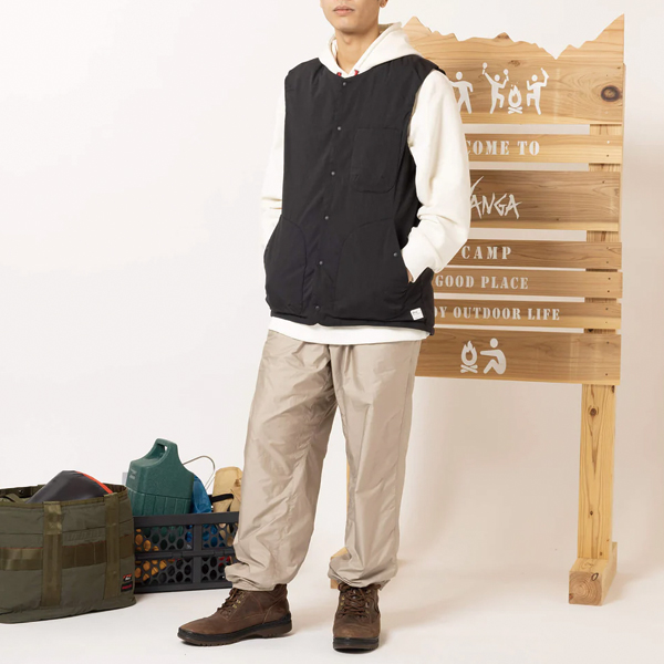 ナンガでは初となるタキビリップストップを使ったインナーダウンベスト。 コットンライクな見た目で、アウトドアスタイルはもちろん、カジュアルスタイルにもぴったり。 タキビリップストップは、捲縮糸を使用しナチュラルなストレッチ性、 弾力性を持たせた生地で、常に快適な着心地になっています。 胸ポケットが1つ、腰ポケットが2つのシンプルなデザインで、 インナーとして着用する場合は、どんなアウターとも合わせやすくなっています。 さらに、ノーカラーにする事で、 襟があるとアウターの襟と干渉し合う事もありません。 ベストは、腕周りがすっきりして動きやすさを重視しの方にオススメ。 10~11月ごろまではアウターとして、12月以降はオーバーコートの インナーとしても着用いただけますので、長い期間ご着用いただける万能アイテム。 | ||||||