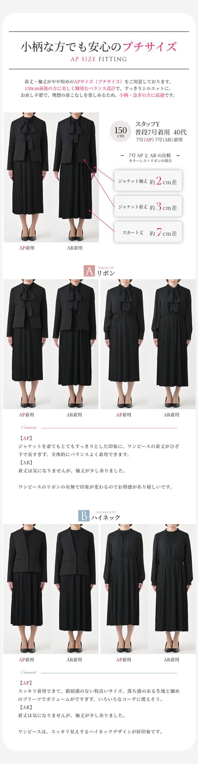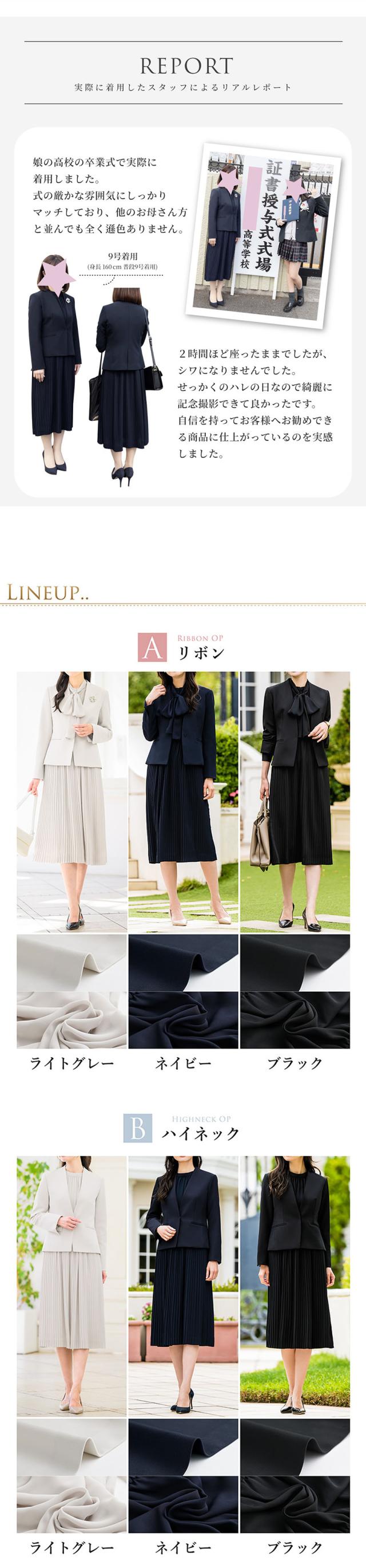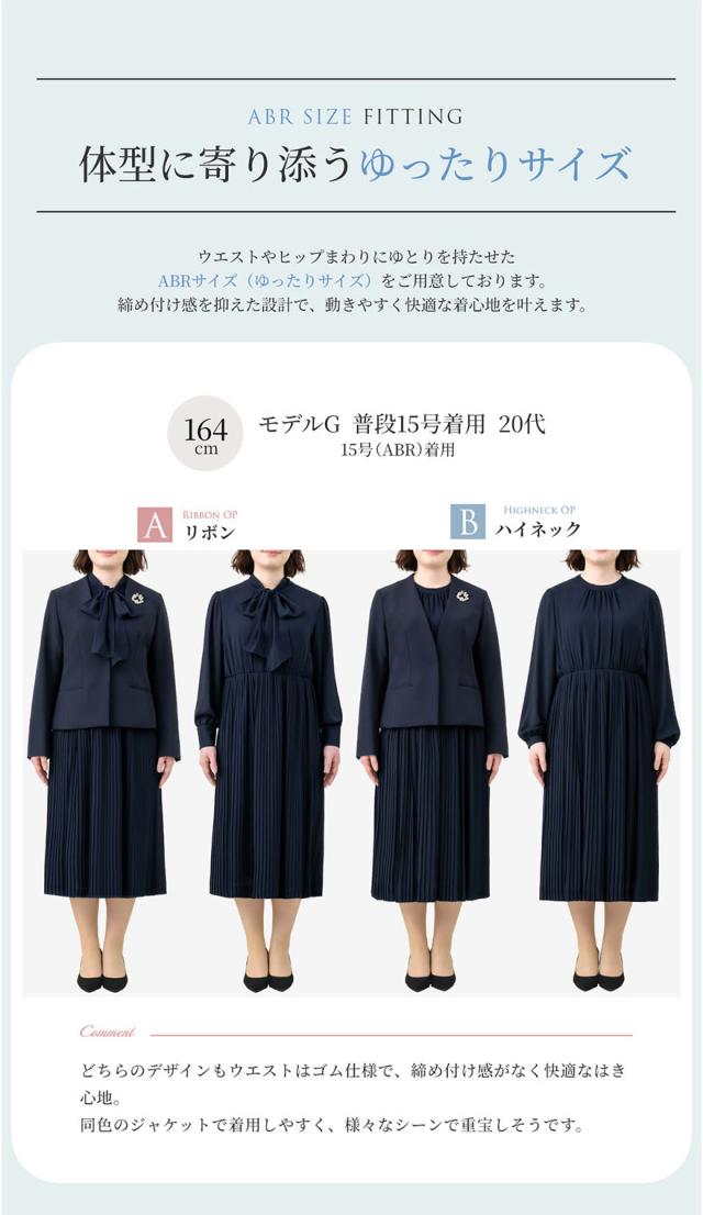 | シンプルな無地ジャケットと上品なプリーツワンピースでたっぷり着回しを楽しめる2点セット! 入学式のお祝い事が重なるシーズンは何かと物入り… 「そのとき用」は勿体ないので、足したり引いたりしてたくさん着回せるセットスーツをご用意しました♪ 【選べるデザイン】 Aリボン:カラーレスジャケット+リボンワンピースのセットです。リボンの取り外しが可能な2wayデザインのため、一着で2つの顔を楽しめます。 また、前開きのため着脱が簡単に。授乳期のママにもおすすめです♪ Bハイネック:カラーレスジャケット+ハイネックワンピースのセットです。首元にギャザーが入っており、シンプルながらも上品な一着。 袖にパールボタンが付いており、細部にも女性らしさを感じるデザインです。 どちらのデザインもスカート部分や生地は共通で、動いた時の揺れ感が上品な軽い素材を使用。 華やかな印象のプリーツデザインが女性らしさを後押しします。 少し長めのレングスで座った時も膝が出ず好印象◎ 【カラーレスジャケット】 すっきりとしたカラーレスデザイン。 両サイドには便利なポケット付きで、大人のグレードを感じさせる魅せるホックがアクセントに。 程良い厚みとハリ感できちんとした印象でありつつ、ストレッチが効いており、ラクな着心地です。 【プリーツワンピース】 長時間でもリラックスできるよう、ワンピースのウエストをゴム仕様にして楽な着心地に。 高めの切り替えなため着やせ効果も期待できます◎ 妊娠初期や産後のママにもおすすめ♪ 【抜群の着回し力】 入学式や卒業式といったセレモニーはもちろん、お子様の学校行事や通勤、オフィス・デイリー・ディナーにも。 どんなシーンにもマッチして1着あると便利なワンピーススーツです。 【ウォッシャブルスーツ】 ご家庭で手軽に洗えるためいつも清潔にご着用いただけます。 クリーニング代も抑えられて経済的。 【セット違いもご用意】 こちらの商品と同じデザインのワンピースの単品販売、またジャケットが2種類セットになった3点セットも販売しております。是非ご利用くださいませ。 フォーマルシーンのみならず、どんなシーンにも活躍する優れもの。 ワードローブに一着は欲しいきれいめワンピーススーツです。 | |