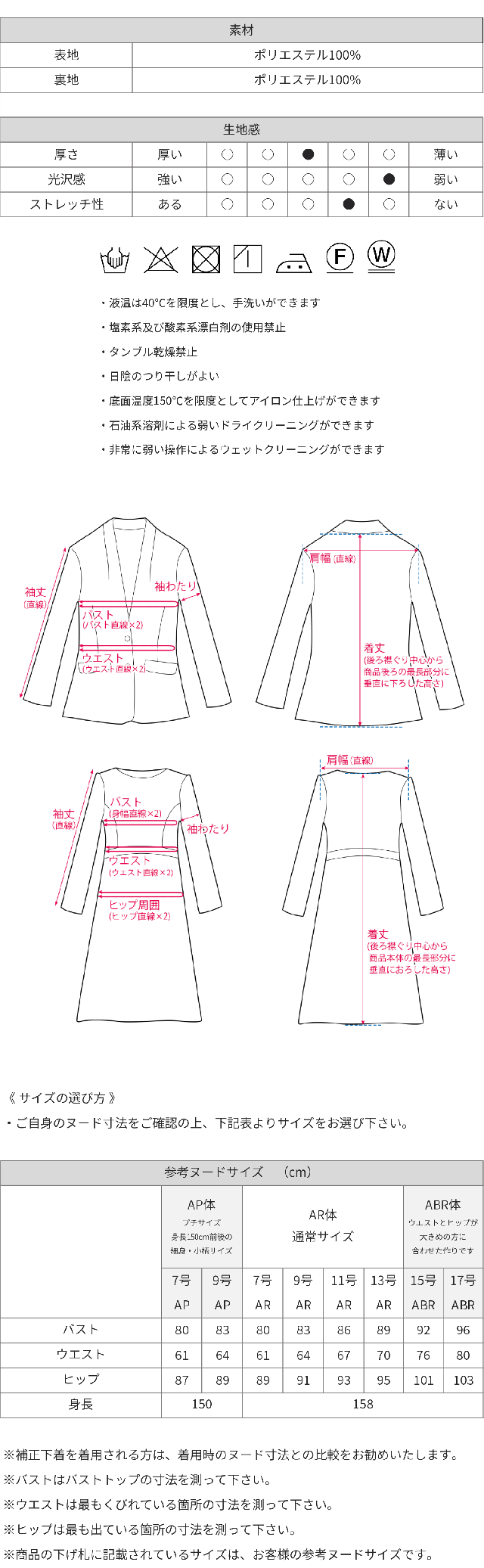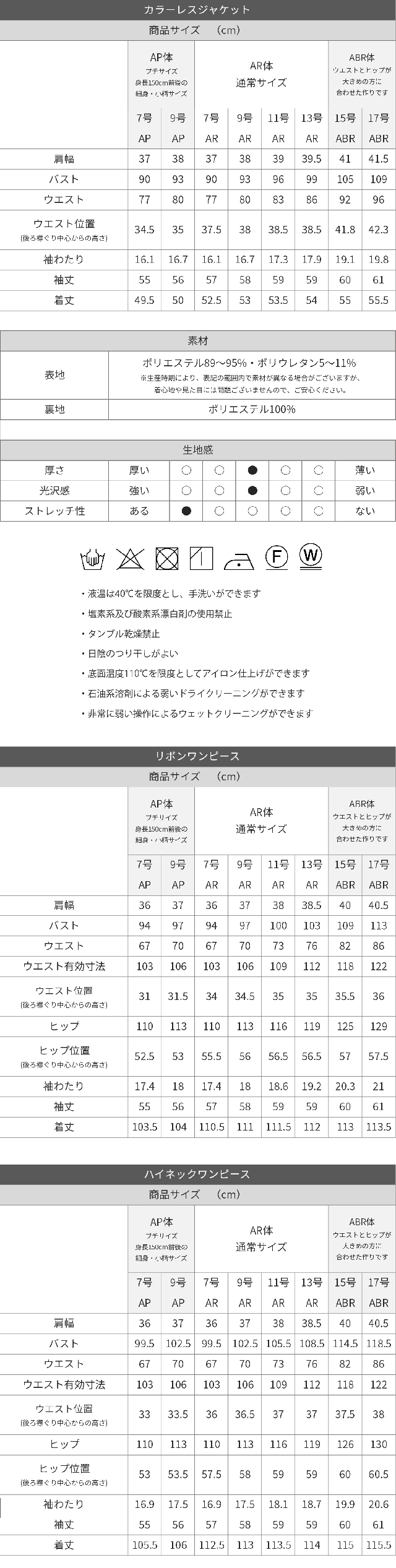 | 【カラーレスジャケット】表地:ポリエステル89%・ポリウレタン11% 裏地:ポリエステル 100% (生産時期により表地:ポリエステル90%・ポリウレタン10%の場合がございます。着用時や見た目に問題はございません。予めご了承いただきますようお願い申し上げます。) 【ノーカラージャケット・ワンピース】表地:ポリエステル 100% 裏地:ポリエステル 100% | |