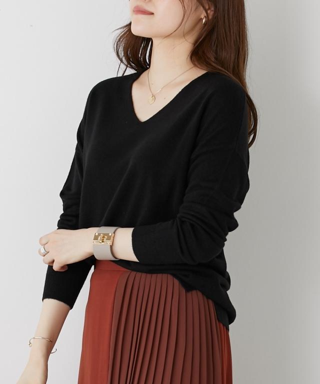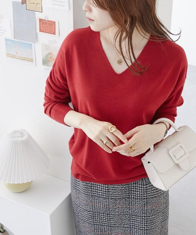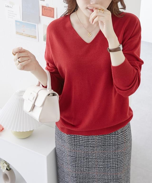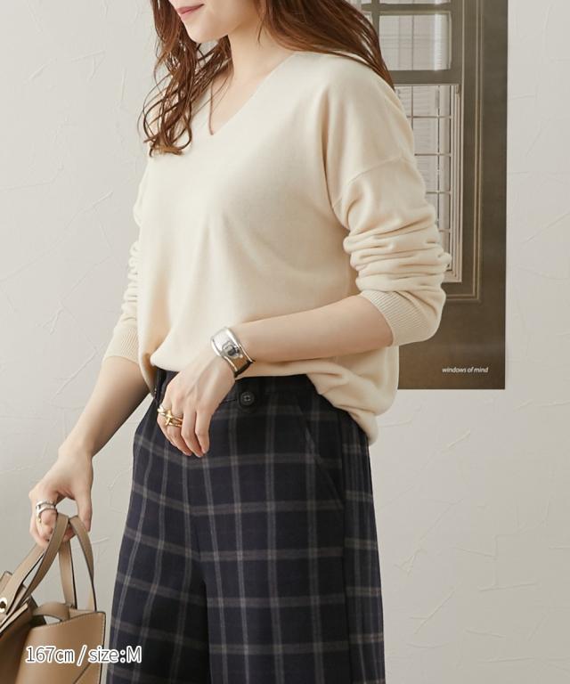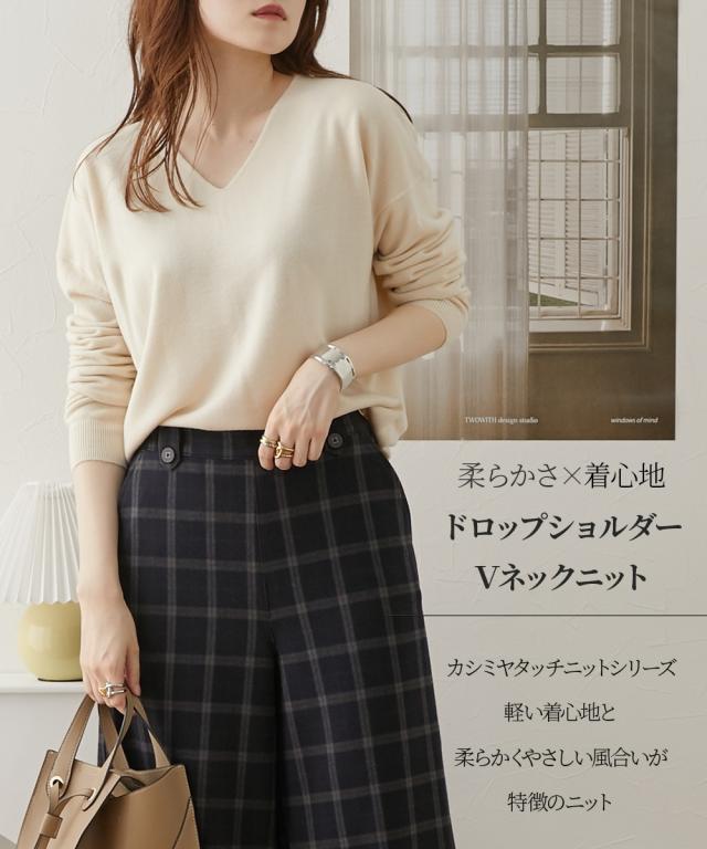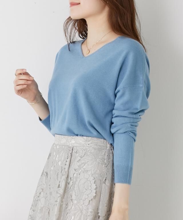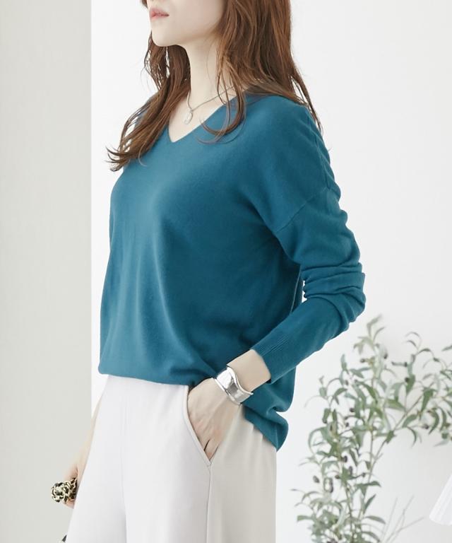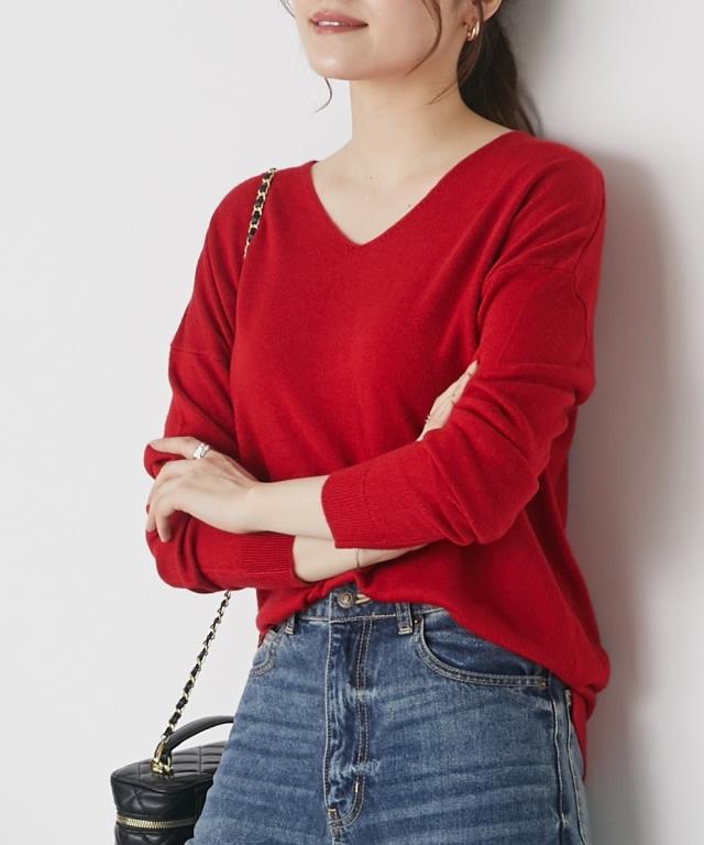 首回りをすっきり見せるVネック、こなれ感のあるドロップショルダーがシンプルなのにセンス良く仕上げてくれるニット。カシミヤタッチの軽くて柔らかな風合いが優しく包み込んでくれます。デニムからきれいめパンツやスカートまで、スタイリングの幅が広がります。