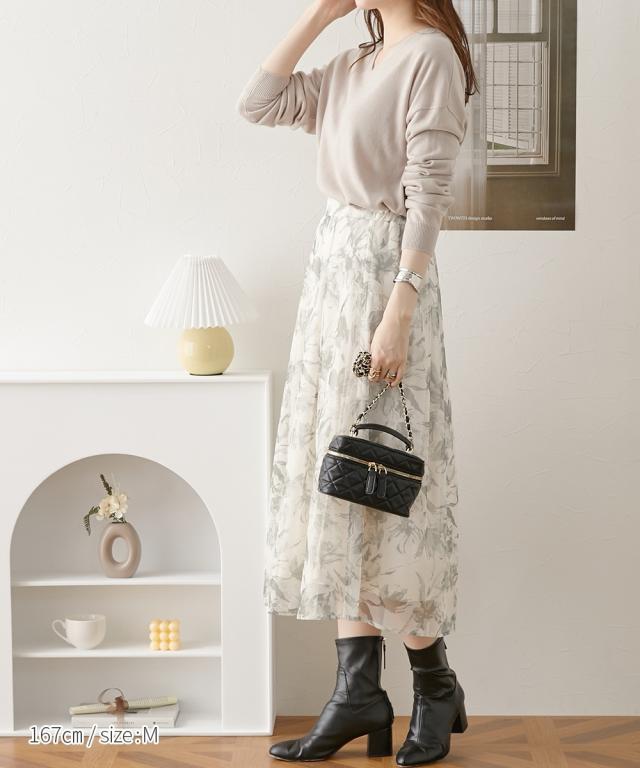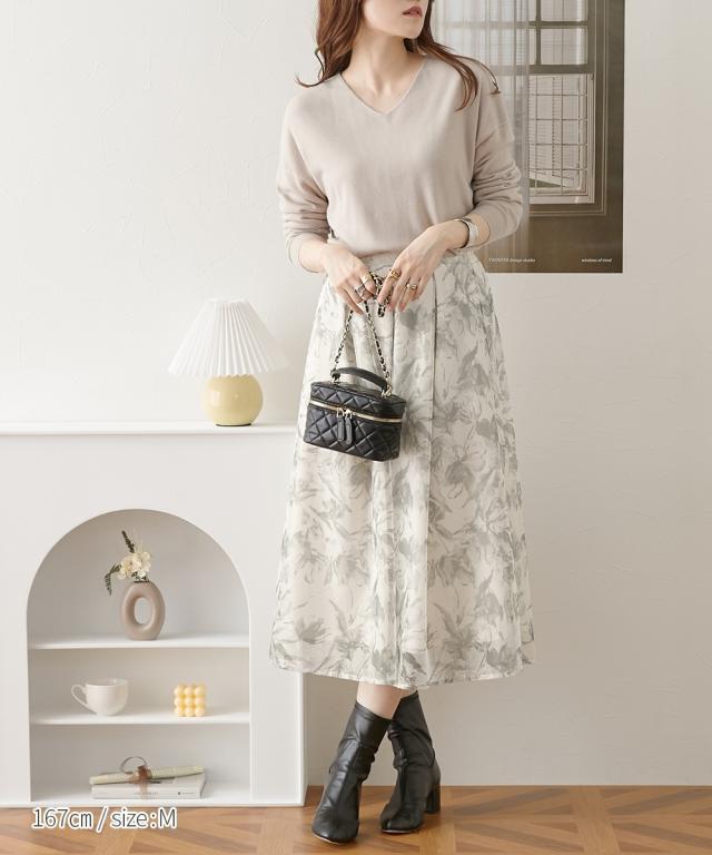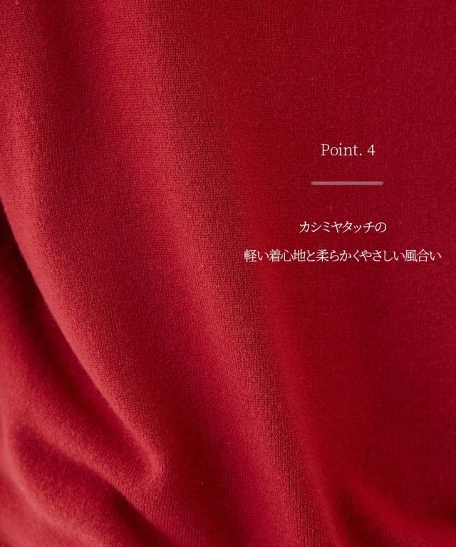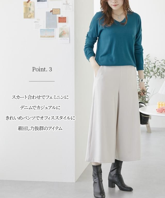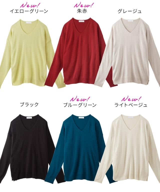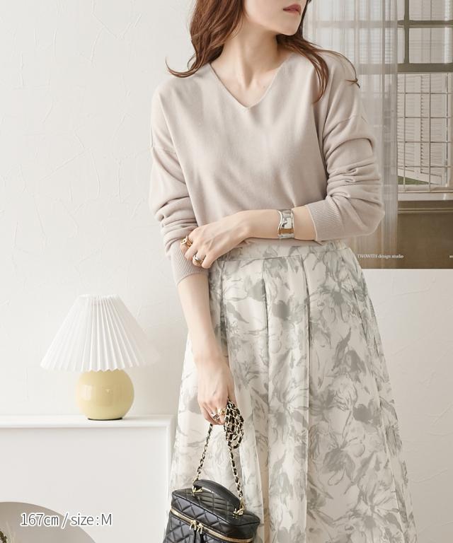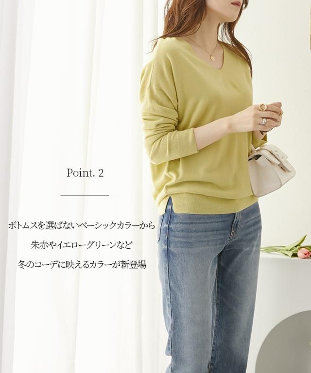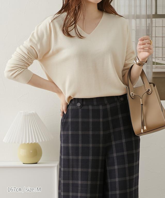 首回りをすっきり見せるVネック、こなれ感のあるドロップショルダーがシンプルなのにセンス良く仕上げてくれるニット。カシミヤタッチの軽くて柔らかな風合いが優しく包み込んでくれます。デニムからきれいめパンツやスカートまで、スタイリングの幅が広がります。