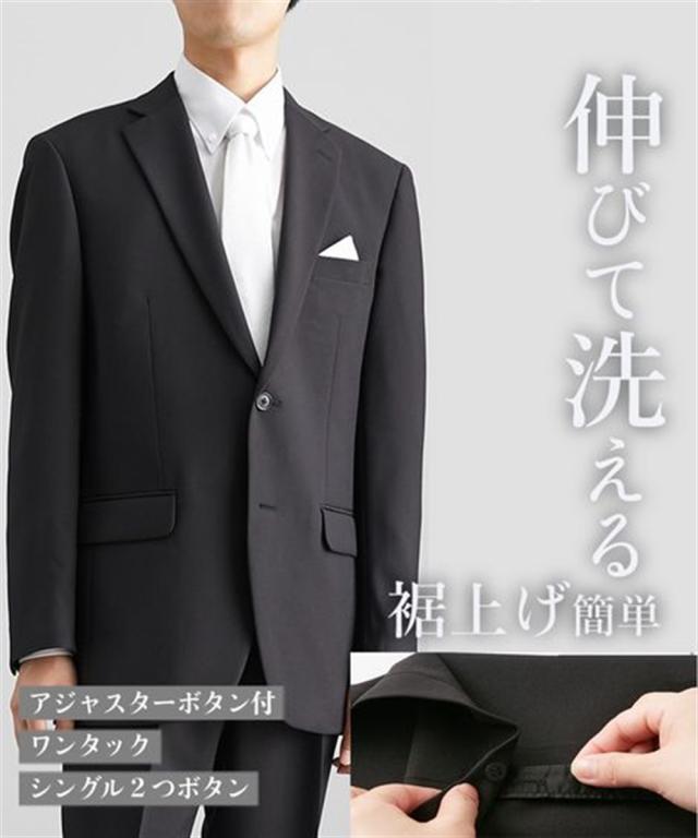 裾上げ簡単! 洗えるアジャスター付きストレッチ素材フォーマルスーツ(シングル2つボタン+ワンタックパンツ)