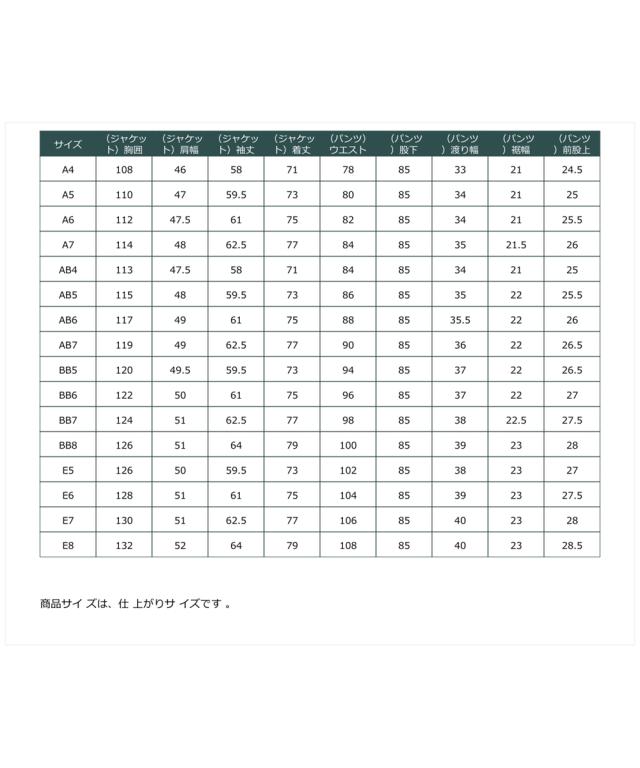 | ・ E5:170_100/E6:175_102/E7:180_104/E8:185_106(身長・ウエスト、単位:cm) はこちら |
