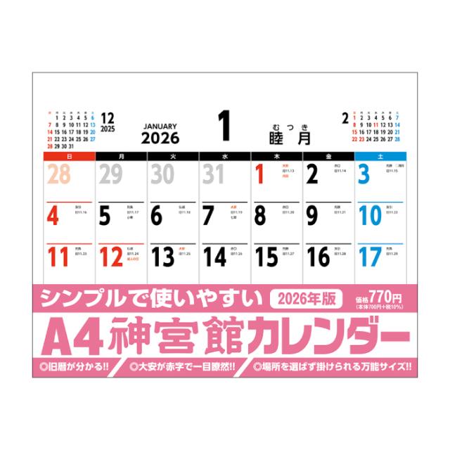 | 2026年 壁掛け A4 神宮館カレンダー 商品詳細 | |