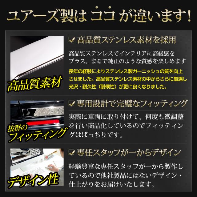 エクステリアに高級感をプラスして、ワンランク上のドレスアップを手に入れられます! 実際に車両に取り付け、何度も微調整を行い商品化しているのでフィッティングはバッチリ。 経験豊富な専任スタッフが一から制作しているので他社製品にはないデザイン・仕上がりをお届けいたします! 届いた時点で強力両面テープがメッキ裏面についておりますので、あとは取り付け箇所をしっかり脱脂して貼り付けるだけでOKです! |