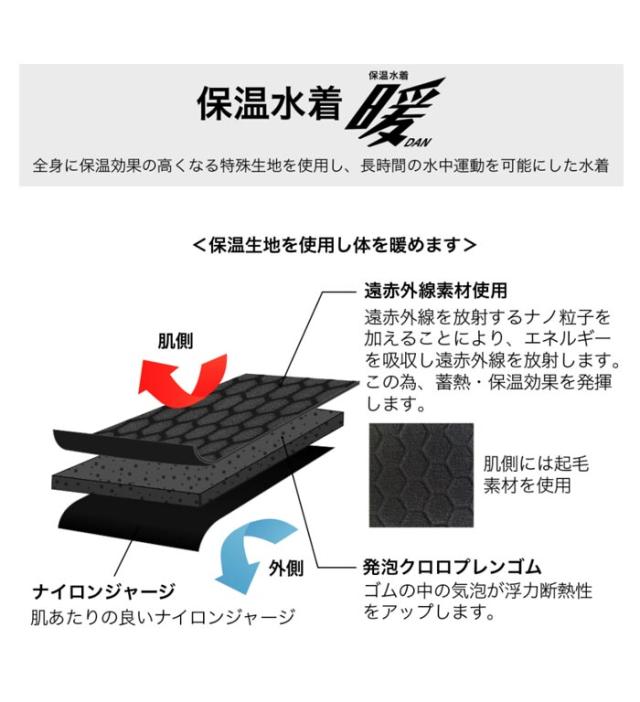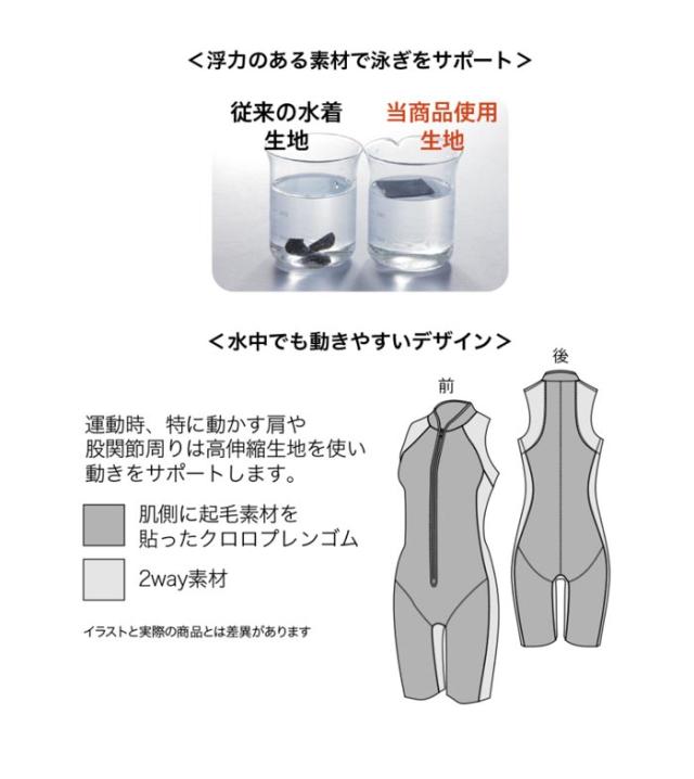 全身に保温効果の高くなる特殊生地を使用し、長時間の水中運動を可能にした水着です。差し込みパット付きです。