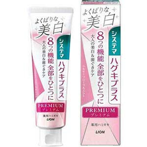 |【システマ ハグキプラス プレミアムハミガキ 美白 シルキーフローラルミントの商品詳細】●歯面から歯の根元の着色汚れまで落とす「大人のための美白ケア」を中心に8つの機能全部がひとつなったプレミアム処方の薬用ハミガキ。(1)歯を白くする:歯面・歯の根元両方に働く「ダブルホワイトニング処方」歯面と歯の根元の着色汚れを浮かせて除去しやすくする。(2)4つの作用で歯周病を防ぐ・歯ぐき活性化・組織修復作用(ビタミンE)・コラーゲン分解抑制作用(トラネキサム酸)・浸透殺菌作用(IPMP)・抗炎症作用(トラネキサム酸)(3)歯がしみる痛みを防ぐイオンバリア効果で薬用成分硝酸カリウムが刺激の伝達を防ぎ、知覚過敏で歯がしみる痛みを防ぐ。(4)ムシ歯予防(高濃度フッ素1450ppm配合)(5)出血予防(6)歯石沈着予防(7)口臭防止(8)口中浄化●高吸収処方:薬用成分(トラネキサム酸)が歯ぐきに吸収されやすく、効果的に働く...システマ ハグキプラス プレミアムハミガキ 美白 シルキーフローラルミント/大人のための美白ケア&8つの機能全部を一つにシステマ ハグキプラス プレミアムハミガキ 美白 シルキーフローラルミント歯磨き粉 ハミガキブランド:システマ【発売元、製造元、輸入元又は販売元】ライオン(株)|【お買い上げ前にお読みください】