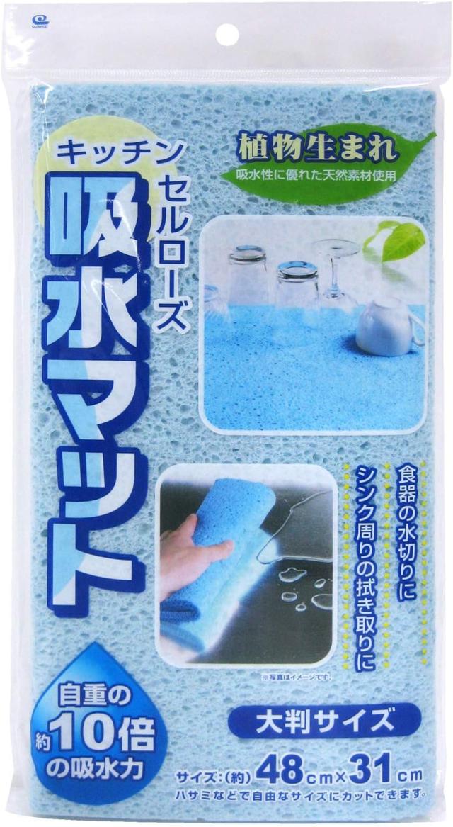 吸水力にすぐれたセルローズを使用した、大判サイズのキッチン吸水マット。自重の約10倍の吸水力! 食器の水切りや、シンク周りの拭き取りに。約48×31cmの大判サイズ。 ハサミなどで自由なサイズにカットして使えます。植物生まれの天然素材セルローズ使用。 環境に優しい製品です。サイズ(約):48×31cm(湿潤時)材質:セルローズ(植物性繊維素)耐熱温度:120度