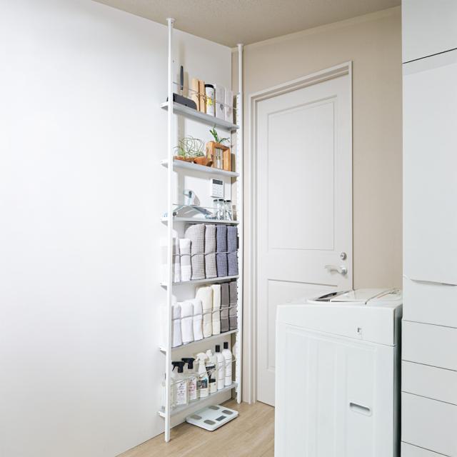 奥行約12cm(突っ張り部分含む)という超薄型設計で、これまで収納を諦めていた狭いスペースにも設置できます。本体奥行は10.5cmながら、天井までの高さを活かした収納力が魅力です。幅40cm・55cm・70cmの3サイズから選べ、高さは215〜260cmまで調節可能。スチール製フレームで安定感があり、湿気の多い洗面所でも安心して使える頑丈な造りです。
