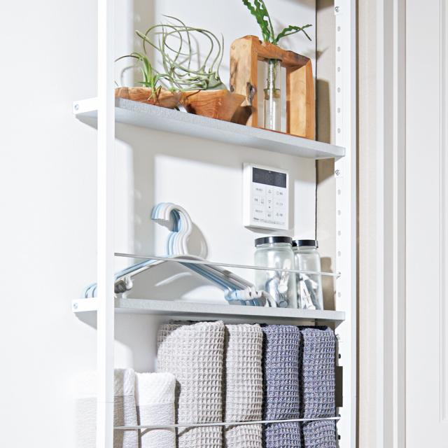 玄関では靴のケア用品やスリッパを、洗面所ではタオルや洗面用品を、リビングでは本や小物を、空間を圧迫せず、すっきりと暮らしに溶け込みながら、収納の可能性を広げるアイテムです。