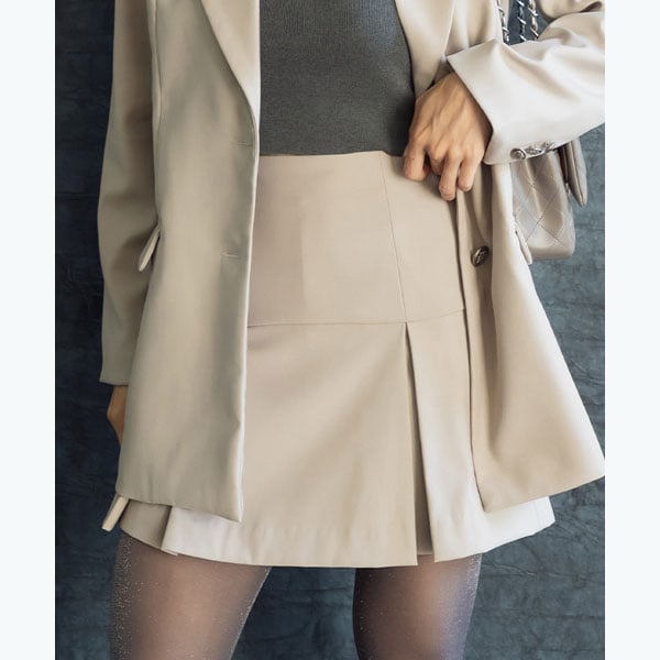 一見台形スカートのようなコンパクトなフォルムですが、歩くたび動きの出るボックスプリーツ仕様で、