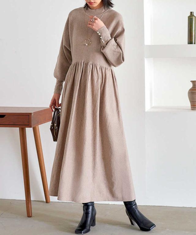 【M、L】パール釦ハイネックドルマンロングニットワンピ