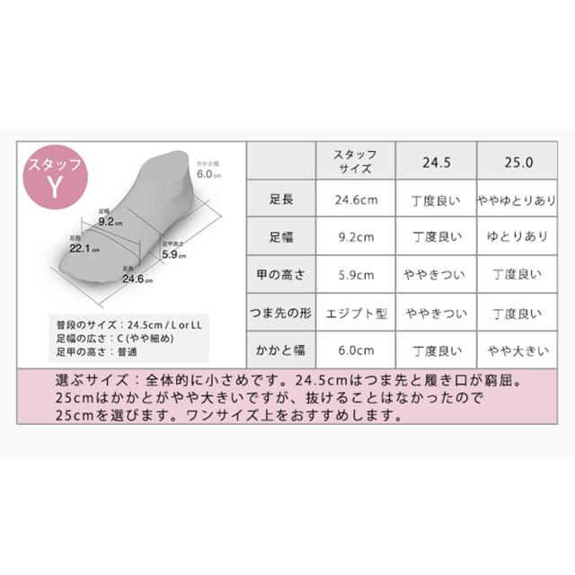サイズ感:普段24.5cmのスタッフは25cmでぴったりサイズでした。やや小さめのサイズ感です。