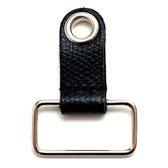 ストラップやショルダーベルトの中間に取り付けて、革小物や鍵などをぶら下げるためのレザーアイテムです。ツールホルダーの金具部分にストラップを通し、革パーツを挟みこめば装着完了。ハトメ穴にポーチやミニ財布などをぶらさげて使用します。好きな位置で固定できるので、体型に合わせてお使いいただけます。