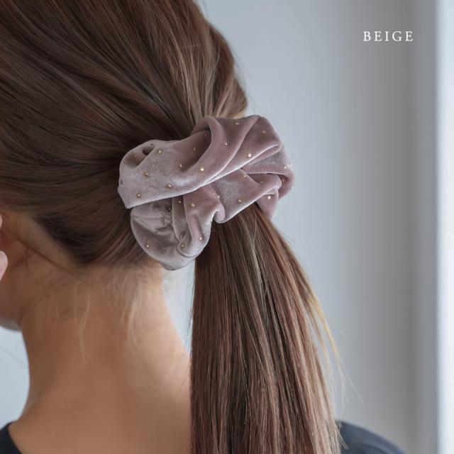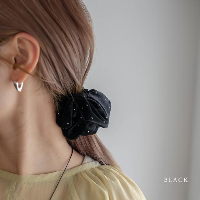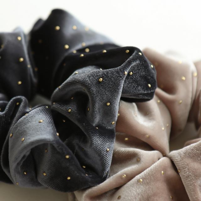 | シックで上品な雰囲気のベロア風シュシュです。 生地特有の優しく上品な光沢とゴールドのドット柄が、きれいめにもカジュアルスタイルにもぴったり。 これひとつでまとめ髪を一気に華やかに仕上げてくれます。 | |
