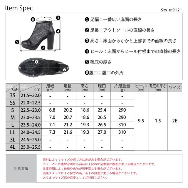 ブーツ レディース メッシュ ショート丈 バックジップ ラウンドトゥ チャンキーヒール 美脚 9.5cmヒール 合皮 ブラック No.9121 22.5cm-24.5cm リバティードール
