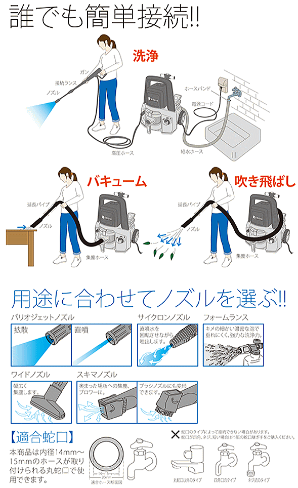 泡洗浄、バキューム、吹き飛ばしの3つの機能をひとまとめにした便利な1台です。