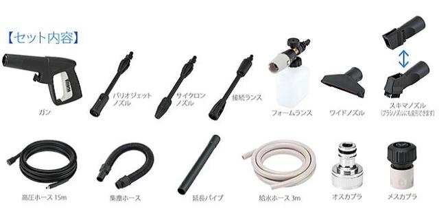 | 機能・特徴 | ・泡洗浄、バキューム、吹き飛ばしの3つの機能をひとまとめにした便利な1台です。 ・スイッチ一つで高圧洗浄機とバキュームクリーナーの切り替えができます。 ・きめ細かい泡を出せるフォームランス付きです。 ・伸縮ハンドルとタイヤ付きで移動も楽に行えます。 ・モノトーンデザインで周りとも調和し、コンパクト設計です。 |