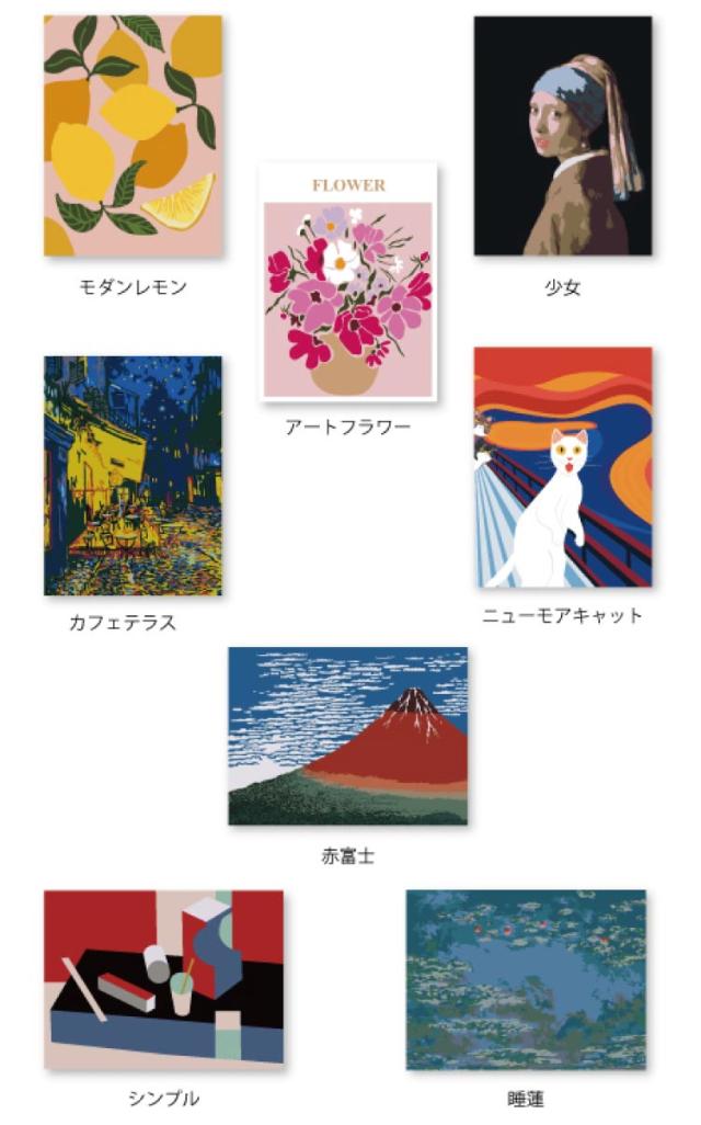 キャンバス×1、額×1、筆(大×1、中×1、小×1、極小×1)、アクリル絵の具セット(柄によって8色〜19色)、取扱説明書×1、紐×1、壁掛け用金具×2