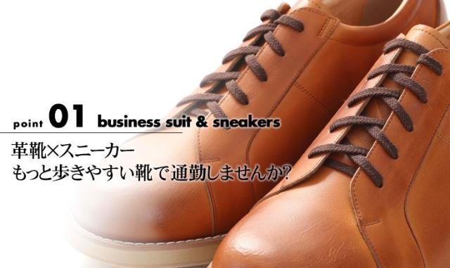 ビジネススタイルの自由度が増しつつある現在、スーツをレザースニーカーでハズすことで、できる男を演出。