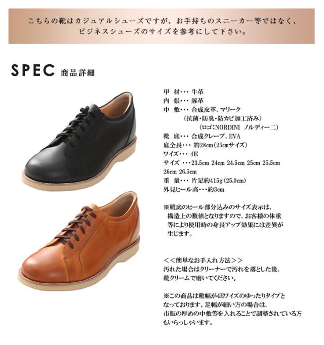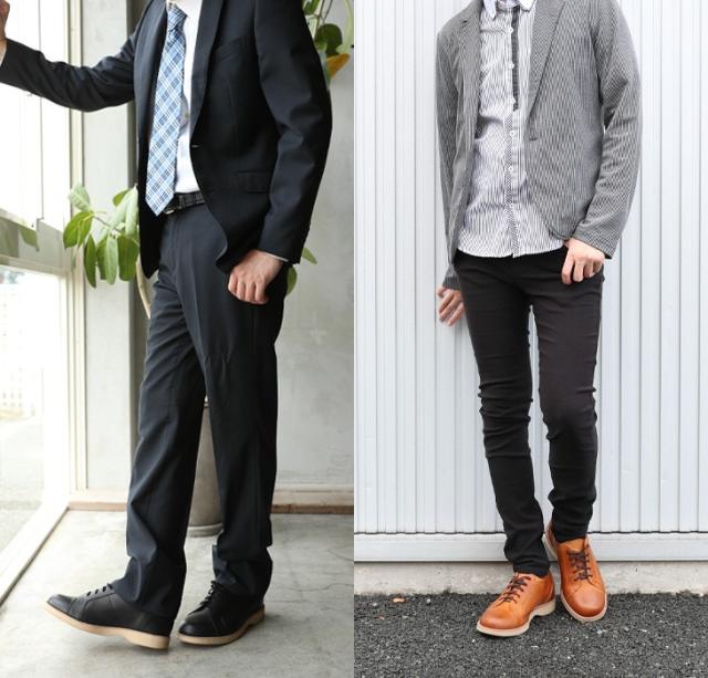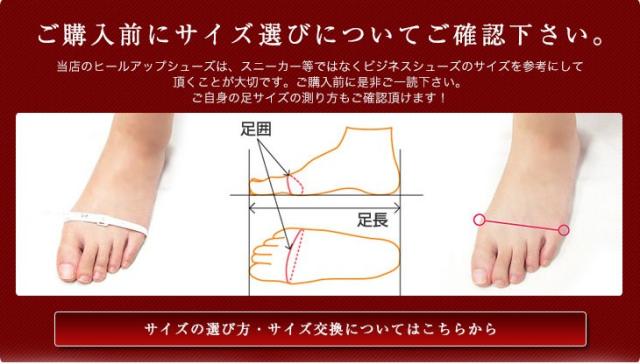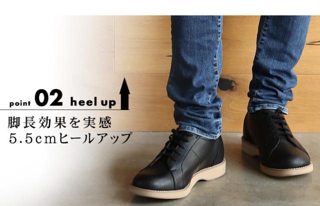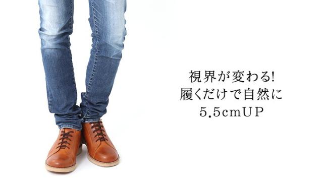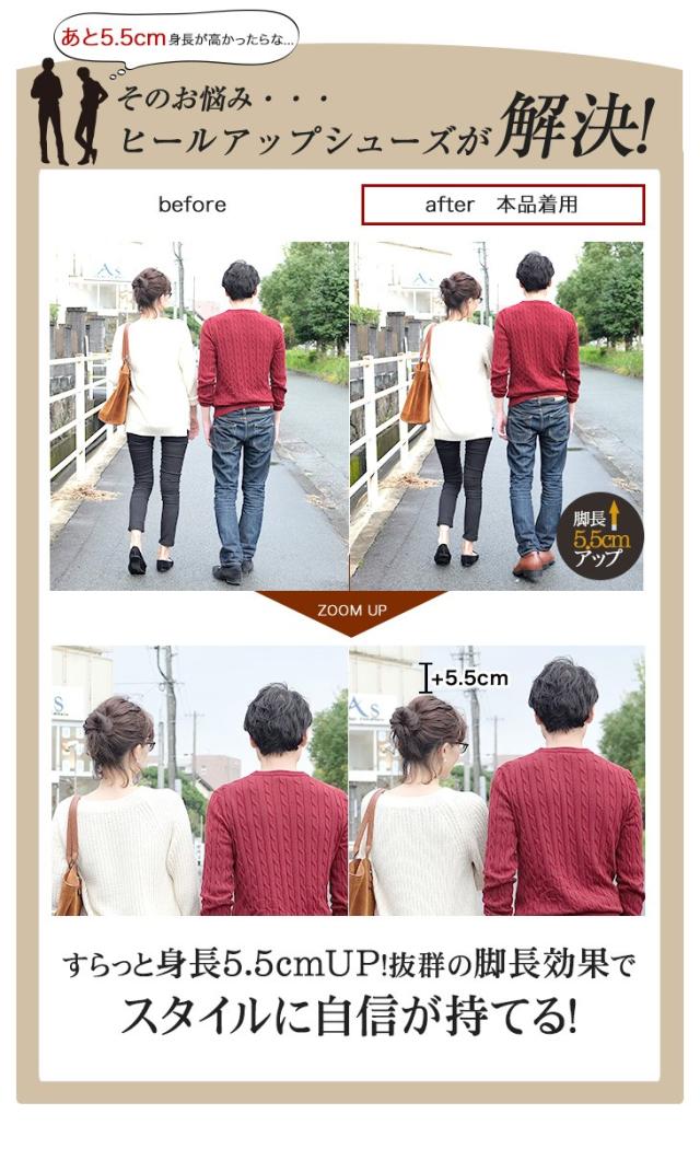 5cm、5.5cm、6cm、7cmアップという表記は靴底のヒール部分込みの構造上の数値ですので、お客様の体重等により、使用時の身長アップ効果に差異が生じます。